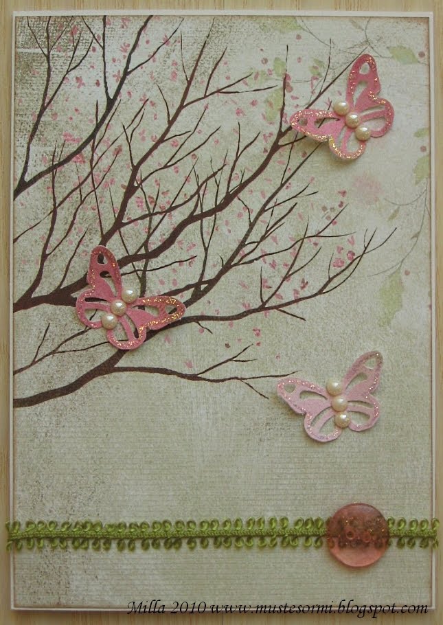 Tässä toisessa kortissa ei ole sitten leimailua ollenkaan (ensin jää pois leimakuvien väritys, sitten leimailu - mitä seuraavaksi?! ;) ). Eli kaikessa yksinkertaisuudessaan tässä on vain nätti paperi, muutama leikattu perhonen ja koristeita.