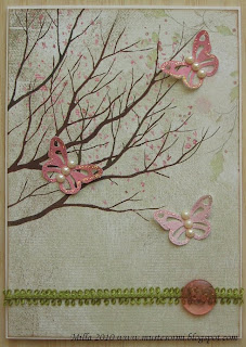 There's no stamping in this second card at all (first I seem to leave out the colouring of stamped images, then I leave out stamping altogether - what's next?! ;) ). Basically there's just a piece of pretty paper, some butterflies and a few embellishments, nothing else. Sweet and simple?