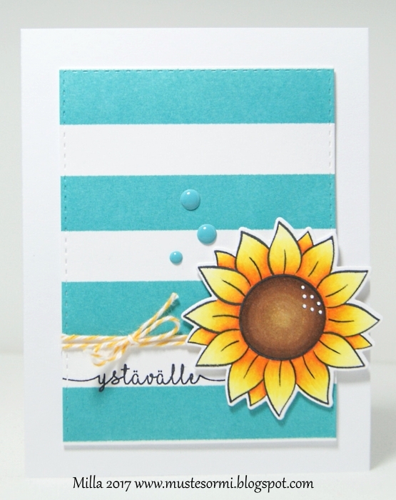 It seems that I can't get enough of colour therapy and sunflowers now in the dead of winter! :) I noticed a lovely sketch challenge over at Seven Hills Crafts and made this following the said sketch. I used the biggest sunflower in the 'Our Friendship Grows' set by Lawn Fawn, coloured it with my Copics and attached with foam adhesives. I stamped the stripey background with 'Wide Stripes Background' stamp by Simon Says Stamp and their 'High Dive' ink, and die cut it with Simon's 'Stitched Rectangles' die. I attached it to the cardbase with foam adhesives, so it is a bit raised. The sentiment says 'for a friend' in Finnish, and as embellishments I've used some baker's twine and a few enamel dots.
