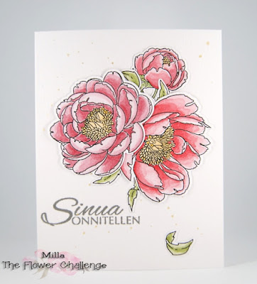 Yksi lempikukistani on pioni ja käytinkin korttiini Mama Elephantin Peonies in Bloom -settiä. Väritin kukat vesiväreillä ja stanssasin irti. Korttipohjaan roiskin vähän kultaa vesivärisiveltimellä ja Sheer Shimmer Spritzillä, minkä jälkeen laitoin kukat ja lehdet paikoilleen ja leimasin tekstileiman.