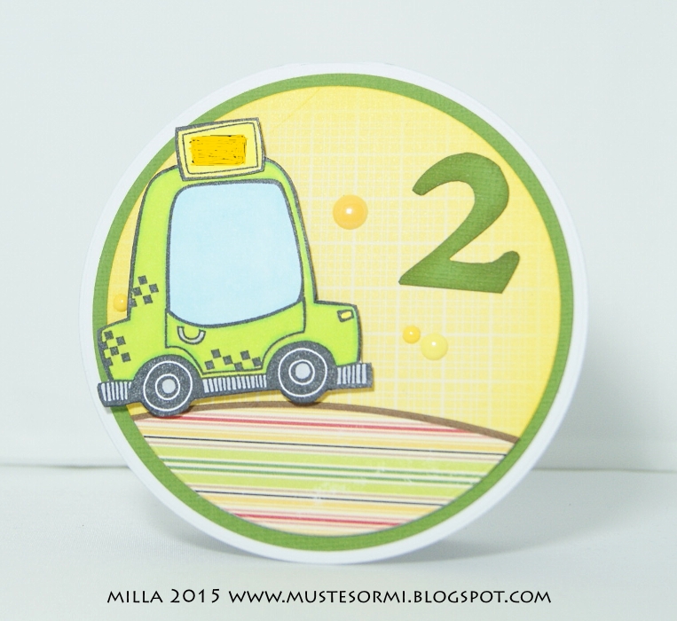 Our youngest son turns two this month and I made him this little birthday card. The car is a DoodleFactory taxi stamp which I coloured with ProMarkers and fussy cut out. The yellow smudge you see on the taxi sign is something I'm very proud of - I had stamped our son's name there and as I want to keep it private, I smudged it out with a picture editing programme, and that is no small miracle let me tell you! I'm really no good at all with computers so to be able to do that is big for me, ha ha! :D But anyways, the card itself is pretty straightforward, there are some enamel dots, the fussy cut number and some October Afternoon papers, and that's about it.