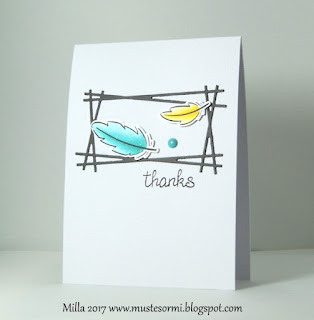 Less Is More Challenge has the theme 'Use a Frame' this week and as it happens, I have this 'Fused Frame' die by Paper Smooches that I've never used before, so I just had to play along. I die cut the frame out of grey cardstock and stamped the Lawn Fawn sentiment with grey ink. I stamped the feathers with Lawn Fawn stamps, die cut them out and coloured with my Copics. I also added a coating of clear Wink of Stella on them before attaching them with foam adhesives. I added one single enamel dot to embellish the card.