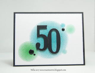 Tein synttärikortin miehen veljelle ja näillä Altenew'n Halftone Circles -leimoilla se onnistui helposti. Leimailin pohjalle ympyröitä Hero Artsin ja Simon Says Stampin musteilla ja Sizzixin stanssilla stanssasin isot numerot, jotka sitten kiinnitin tarrapaloilla koholle. Koko paneelin stanssasin Simonin ommelreunastanssilla ja kiinnitin mustaan korttipohjaan. Lisäksi vain jokunen enamel dots ja kortti oli valmis. Melko CAS mutta se ehkä toimii parhaiten näin miesten korteissa :)