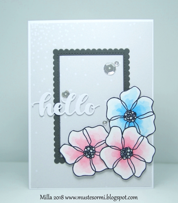 I made this card for the current Create a Smile challenge 'For Someone Special'. You don't need a special day or occasion to send a card to someone special, sometimes a simple 'hello' card is more than enough so that's what I made :) So, I got my new Create a Smile goodies last week (after super fast shipping: ordered them late Sunday evening, got notification of shipping early Monday morning and received my package on Wednesday! Only three days from Germany to Finland! That is quick!!) and had to make a card with them. The flowers come from the 'Magic Flowers' set, I coloured them with my Zig Markers and fussy cut them out. For the background I used some patterned paper, a frame that I die cut with a My Favorite Things die and a sentiment die cut with a Create a Smile die. As embellishments, I only added some sequins.