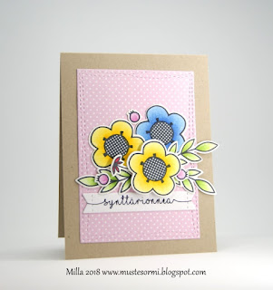Tein synttärikortin Paper Smoochesin leimoilla, leimat ovat setistä Natural Beauties. Väritin leimakuvat Copiceilla ja kiinnitin pohjaan, päällimmäinen keltainen kukka on kohotarralla. Taustan paperin stanssasin MFT:n stanssilla ja tekstileiman leimasin myös MFT:n stanssilla stanssattuun banneriin. Koko komeus sitten kraftin väriseen korttipohjaan ja se oli siinä :)