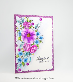 Another birthday card I made for my stash. The stamp I used is 'Flower Cascade' by Penny Black, I coloured it with my Zig Markers (again! They will probably grow into my hands at the rate I'm using them.. :D ). I die cut the panel with 'Antique Frame' die by Penny Black, stamped my sentiment ('Warm Congratulations' in Finnish) and added some sequins. For the background, I stamped 'Indian Wheel' by Penny Black onto some coloured paper with Simon Says Stamp ink.
