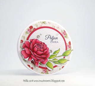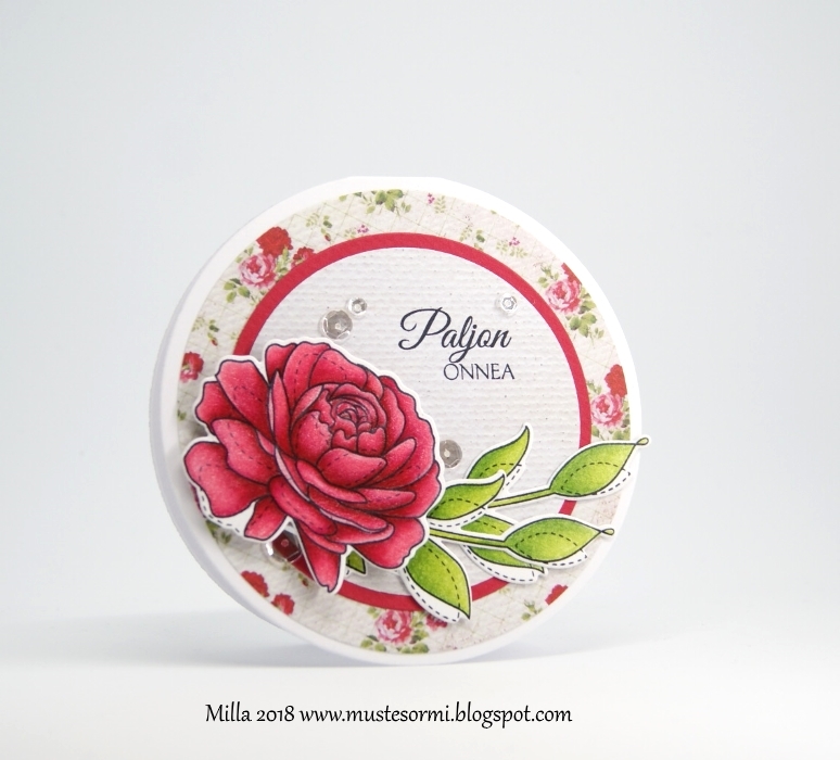 I got a bit carried away colouring with my Polychromos pencils last night and coloured well into the night (I shouldn't have, I know - and feel! - that now.. ;D ). I ended up colouring this rose and leaves from Simon Says Stamp, the rose is from the set 'More Spring Flowers' and the leaves are from 'Spring Flowers'. I had a bit of time today so I made a card with them, a circle card at that, haven't done those in a while. I did all the circle die cutting with Hero Arts dies, the patterned papers are by Lili of the Valley. I stamped my sentiment ('Congrats' in Finnish) and added a few sequins as embellishments. I attached the rose with foam adhesives for a bit of extra interest.