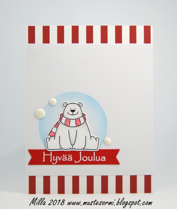 Tämän joulukortin tein MFT:n luonnoshaasteeseen. Jääkarhu on MFT:n Polar Bear Pals -setistä ja Altenew'n vesiväreillä väritetty. Taustalle mustetin ympyrän Distress Inkillä ja tekstileiman embossasin MFT:n stanssilla stanssattuun banneriin. Seuraksi vähän kuviopaperia ja enamel dotseja.