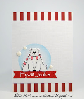 I made this Christmas card for the MFT sketch challenge. I used the cute polar bear from the 'Polar Bear Pals' set by MFT and watercoloured him with my Altenew watercolours. I sponged some Distress Ink to the cardstock to create the circle behind the polar bear. I heat embossed my sentiment (it says 'Merry Christmas' in Finnish) on a banner die cut with an MFT die. Lastly I added a bit of patterned paper and some enamel dots to the card.