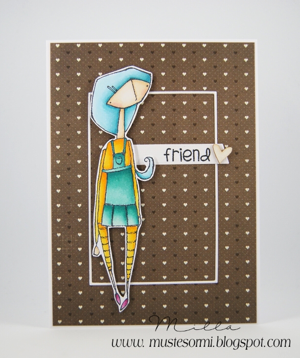 Tein yhden ystävänpäiväkortin Stamping Bellan leimalla. Tämä ihana neitokainen on Altogether Evelyn, jonka väritin Copiceilla ja leikkasin irti. Tekstileima on Paper Smoochesin MFT:n stanssilla stanssattuun banneriin leimattuna. Taustalle laitoin kuviopaperia ja Altenew'n stanssilla stanssatun kehyksen.
