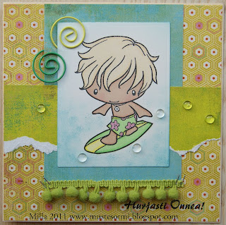 This card is a birthday card for my nephew #4 who soon turns 4! ;) I haven't used a TGF stamp in ages so thought I'd give Surfer Ian here a good inking up. I coloured him with ProMarkers and added some blue Distress Ink to his background, partly with a sponge to give a wave-like feel. I tore the green paper to give it some wave-like feel as well - you can see it, can't you, the waves? ;) The papers I used are by BasicGrey and as embellies there are some paperclips, ribbon, tiny staples and clear dew drops as splashes of water. The sentiment says basically 'many congrats'.