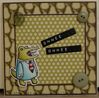 When I said that I couldn't think of colouring a Doodle with anything else than ProMarkers, I was actually thinking more of the Creatures type of DoodleFactory image. So, I had to colour a Creature as well. This is Snargle and he's congratulating my nephew who soon turns 8. I also used some October Afternoon papers, some brown cardstock, some buttons and a sentiment typed with a Dymo that says 'Congrats, congrats'.