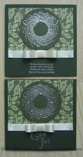 Joulutohinoiden keskelle taas yksi neljän kortin pikkupostaus ;) Eihän sitä pieni kortteilija malta olla postaamatta kaikkia kortteja, kun kerran on niitä saanut tehtyä... *vieno hymy* Näissä ensimmäisissä korteissa on ihana Hero Artsin kranssi hopealla embossattuna, koristeiksi lisäsin muutaman kirkkaan dew dropsin. Suomenkielinen tekstileima on Stempelkellerin ja ruotsinkielinen Finnstamperin. Lisäksi Papermanian paperi, vihreää kartonkia Cuttlebugilla stanssattuna ja satiininauhaa. Kuva on muuten hieman huono, ylempi kortti sai ikkunasta enemmän valoa kuin alempi, joten se näyttää kirkkaammalta mutta oikeasti ovat siis ihan saman värisiä.