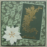 The next two cards are similar to each other, I just made them in different colours. The stamp is Silhouette angel by Inkadinkado, I embossed it with silver powder on the first card and with gold powder on the second. The sentiments say 'Christmas peace', the papers are by Papermania and the poinsettias are made with Marianne Design's die.