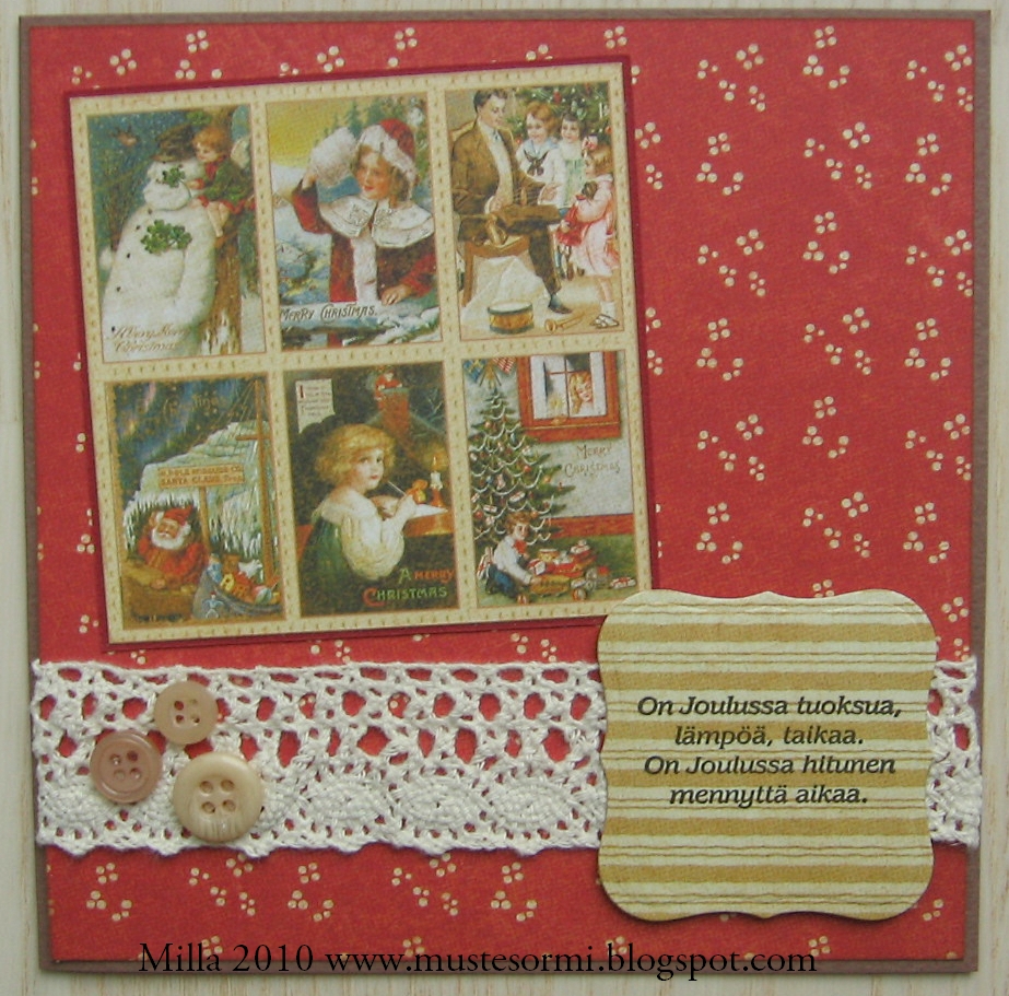 Vaihteeksi joulukortti ilman leimakuvaa (järkyttävää, eikö... ;D )! Käytin tähän korttiin taas Graphic45:n ihania joulupapereita ja leikkasin niistä tuollaisen "kuvaneliön", jonka sitten kiinnitin punaiselle kartongille. Tekstileimasin on Stempelkellerin ja leimasin sen Cuttlebugilla kuvioleikkaamalleni paperille. Lisäksi hieman vanhaa puuvillapitsiä ja muutama nappi.