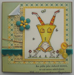 Tein myöhemmin sitten vielä toisen kortin, jossa en huomannut soveltaa tuota kolmiota (muisti kuin kanan lento? ;) ). Tulihan tästäkin ihan kiva mutta ehkä se olisi tosiaan tarvinnut jotain lisää ollakseen parempi. Mutta onpahan nyt ainakin CAS! Leimat Papertrey Inkia ja FinnStamperia.