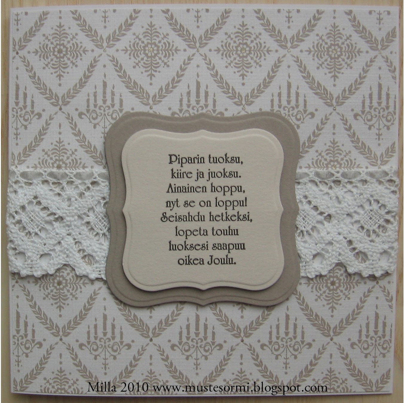 Here are a couple of very simple Christmas cards with the sentiments as their focal points (sorry, once again I won't attempt to translate them but they're little Christmassy poems). The paper is by Papermania and I've just added some lace (I also added some silvery ribbon to the lace on the second card here). Very simple cards but I like them anyway :)