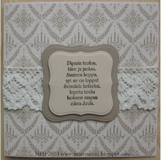 Äitini tarvitsi muutaman onnittelukortin ja tämä on yksi hänelle tekemistäni korteista. Tuo kukka on Hero Artsin Sweet Petals, leimasin sen paperille kolmeen kertaan ja embossasin valkoisella jauheella. "Väritin" kukat vetelemällä Distress Inkiä suoraan leimatyynystä kukkaan ja suihkimalla perään vettä, jossa oli hieman perfect pearlsia. Toisesta kukasta leikkasin irti keskiosan, jonka kiinnitin tarrapaloilla kokonaisen kukan keskustaksi, jotta saisin siihen hieman jotain "ekstraa". Kolmannesta kukasta väritin muutaman lehden vihreäksi samalla menetelmällä ja laitoin ne isolle kukalle lehdiksi. Lisukkeiksi laitoin hieman pitsiä, nyöriä ja October Afternoonin paperia. Tekstileima on Stempelkellerin.