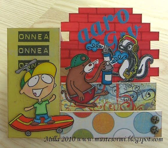 Leimasimet: Sprunk, Guaco, skeittilauta/skateboard DoodleFactoryn Urban-setistä/from the DF Urban set; Nina Åslundin suunnittelema poika-leimasin/the boy stamp is designed by Nina Åslund (leimasimessa pojan paidassa on pääkallo, mutta jätin sen itse pois, sillä en ole oikein viehättynyt pääkalloista lasten vaatteissa, täti mikä täti... ;) /in the stamp there's a skull on the boy's T-shirt but I left it out as I'm not that keen on skulls on little children's clothes, guess that shows my age... ;) ); teksti-leimasin Merjan ja Paulan setistä/the sentiment says 'congrats'