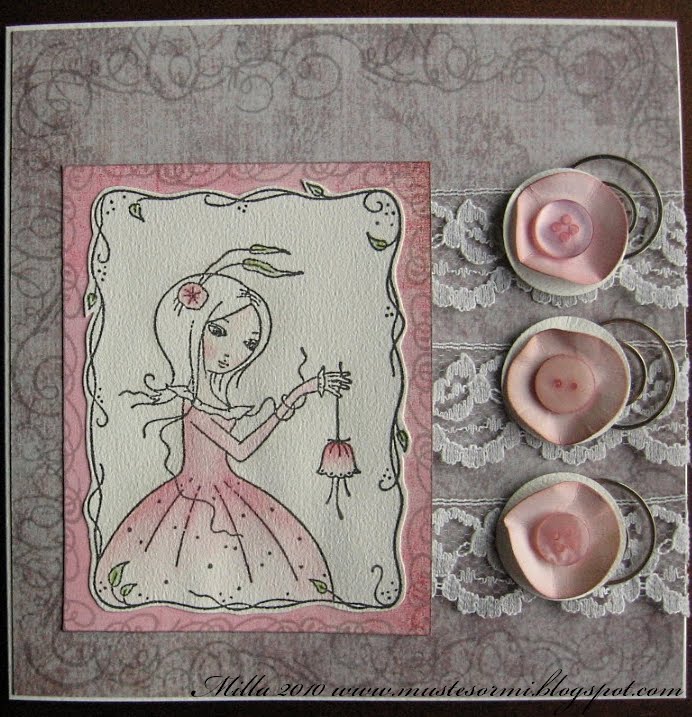 Greetings from behind piles of diapers! ;) I have managed to tear myself away from The Tiny One enough to make a few cards although I haven't had time to post them in my blog. I'll post this one quickly as I'll submit it to the "new and improved" Sugar Bowl challenge. The sketch is by Lilian (and what a fab sketch it is!) and the theme is pink, black and white. Fortunately for me it's not obligatory to follow the theme as black turned out to be grey in my card! ;) From now on I won't list the ingredients of my cards as I only have limited amount of time to spend blogging but if you have any questions regarding the ingredients (or anything else for that matter!), please ask. The stamp, however, is by Leanne Ellis for Sugar Nellie and it's called Belle Flower.