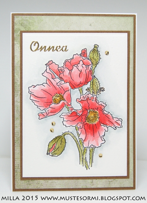 I've another flower card to show you today. This one was a commission card and it is for someone who has had some tough news lately. I wanted to go happy yet elegant with my card so I chose this flower stamp by Stampendous (I've always thought these are sunflowers but looking at them now, they might just be Echinacea.. Well, whatever they are, they're pretty and happy and that's what matters here, right?). I coloured the stamped image with my Copics and partially die cut it out with a stitched edge die by Simon Says Stamp. The sentiment is by Simon Says Stamp as well. The background paper is by Lili of the Valley (I just love this yellow-purple colour combination at the moment :) ) and as embellies there are some baker's twine and a few rhinestones.