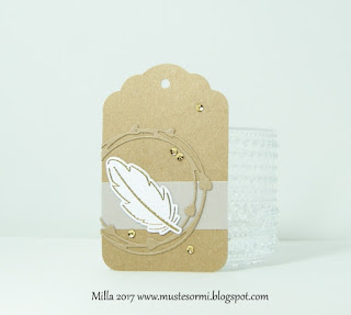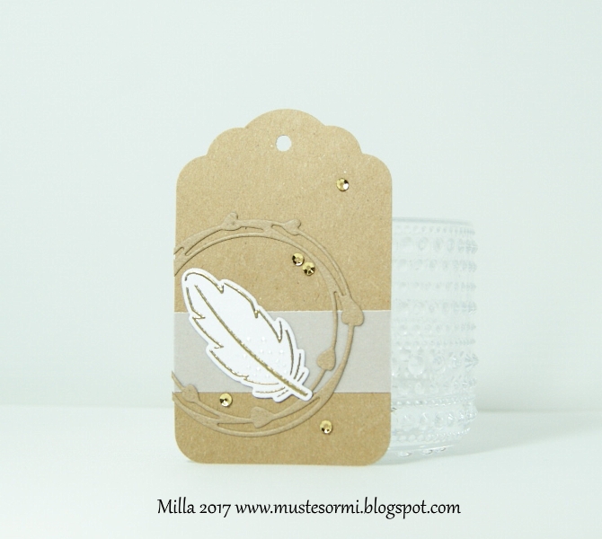 Tein pienen pakettikortin lahjan kylkeen. Käytin siihen höyhenleimaa Lawn Fawnin Dream-setistä, embossasin sen kullalla, "väritin" sen muutamalla kerroksella kirkasta Wink of Stellaa ja lisäsin pieniä Liquid Pearls -tippoja. Taustan ympyrästanssi on Simply Graphicin. Lisänä vellumvyöte ja muutama pieni paljetti.