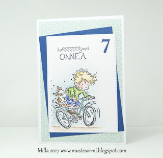 Our eldest son turned 7 last week and I made him this card. We gave him a new bike for his birthday so I decided to make the card using the 'Riding My Bike' stamp by Lili of the Valley. I coloured it with my Distress Markers and added a few tiny drops of Liquid Pearls to represent flying gravel (you've gotta bike fast, right? ;) ). I die cut the panel with the stitched edge die by Simon Says Stamp, added the sentiment (something like 'Congrrrrrats!' in Finnish) and the die cut number. I then layered the image with some blue cardstock and some patterned paper, and the card was done.