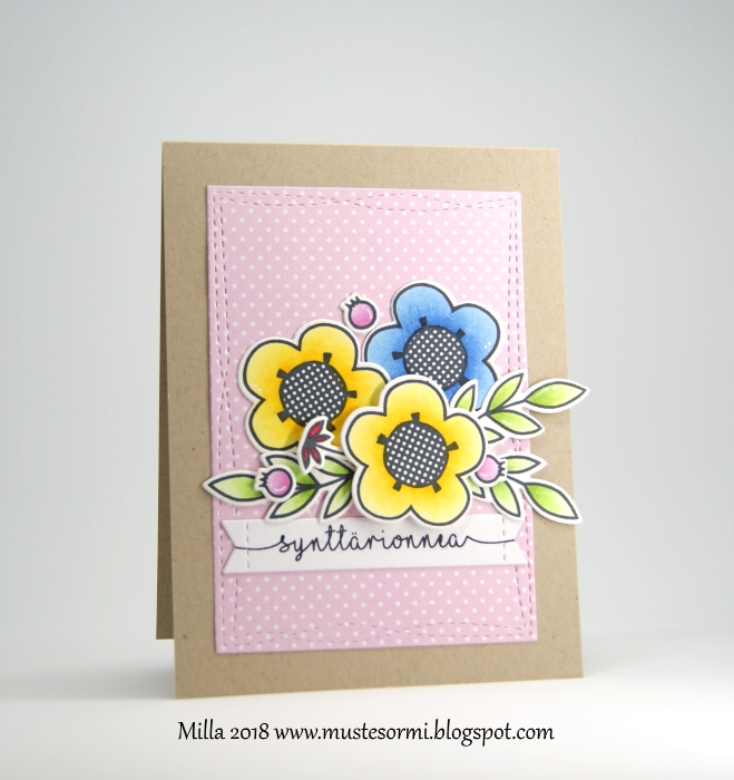 Tein synttärikortin Paper Smoochesin leimoilla, leimat ovat setistä Natural Beauties. Väritin leimakuvat Copiceilla ja kiinnitin pohjaan, päällimmäinen keltainen kukka on kohotarralla. Taustan paperin stanssasin MFT:n stanssilla ja tekstileiman leimasin myös MFT:n stanssilla stanssattuun banneriin. Koko komeus sitten kraftin väriseen korttipohjaan ja se oli siinä :)