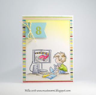 Taas on aika tehdä esikoiselle synttärikortteja. Tähän käytin Lili of the Valleyn Computer Fun -leimaa, väritin kuvan Zigeillä ja stanssasin paneelin irti MFT:n stanssilla. Mustetin paneelin yläosan vihreällä Distress Oxidella, vaikka kuvassa se näyttää paljon keltaisemmalta kuin oikeasti. Banneri on myös MFT:n stanssilla stanssattu, numero taas Memory Boxin stanssilla. Sitten vain taustalle raitapaperia ja nyöri rusetille.