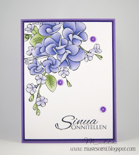 Vesivärit ovat minulle jotenkin helpommat, mutta joskus on kiva värittää Copiceillakin (yleensä silloin, kun se sujuu... ;D ) ja tällä kertaa se oli sekä kivaa että sujui. Tämä leimakuva on Stamplorationsin Precious Plumerias ja se on niin nätti, etten viitsinyt siihen paljoa muuta härpäkettä laittaa, vain tekstileiman ja jokusen paljetin.